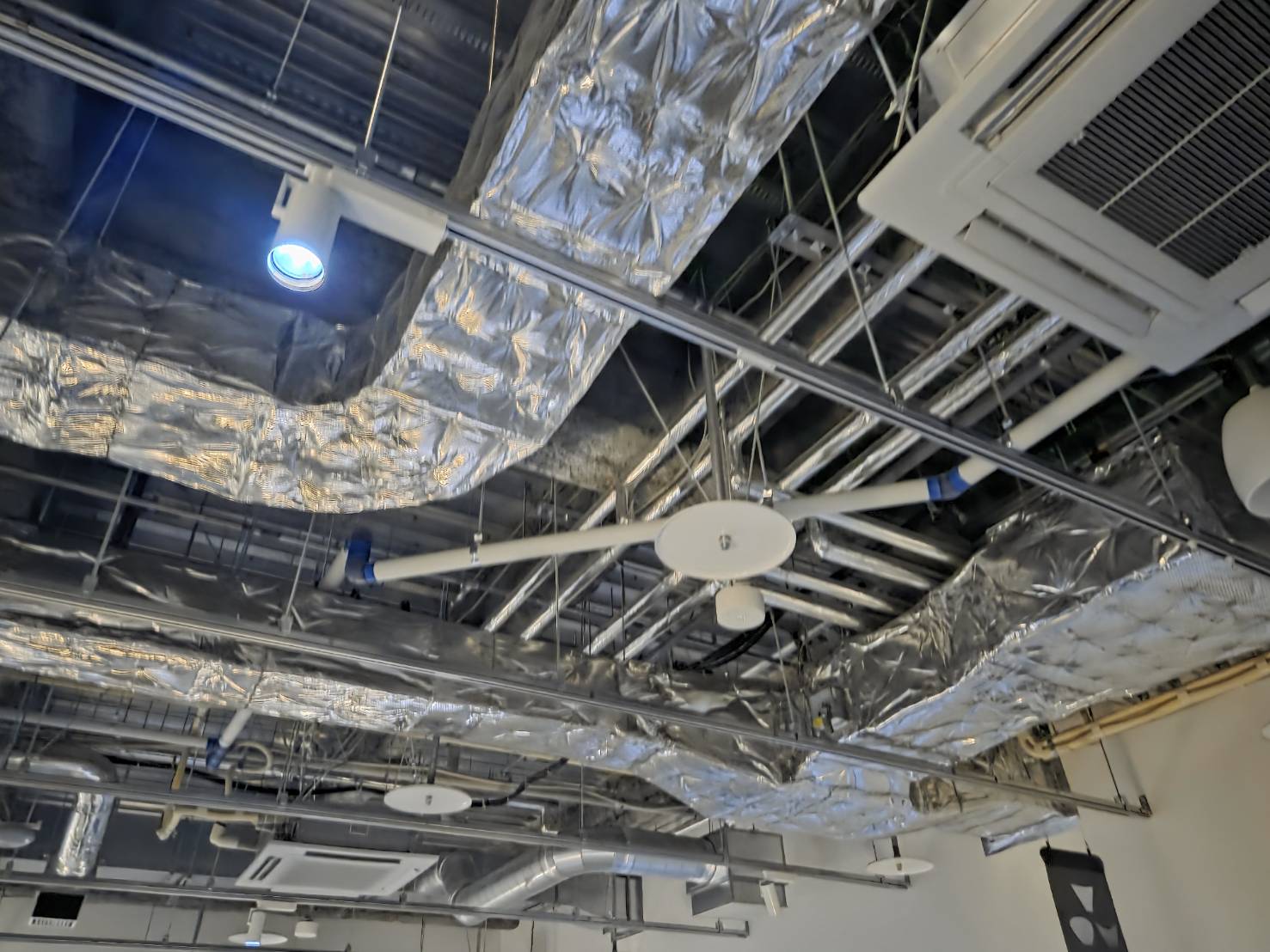 スケルトンの設備露出や保温されたダクトが雰囲気を作っています。
